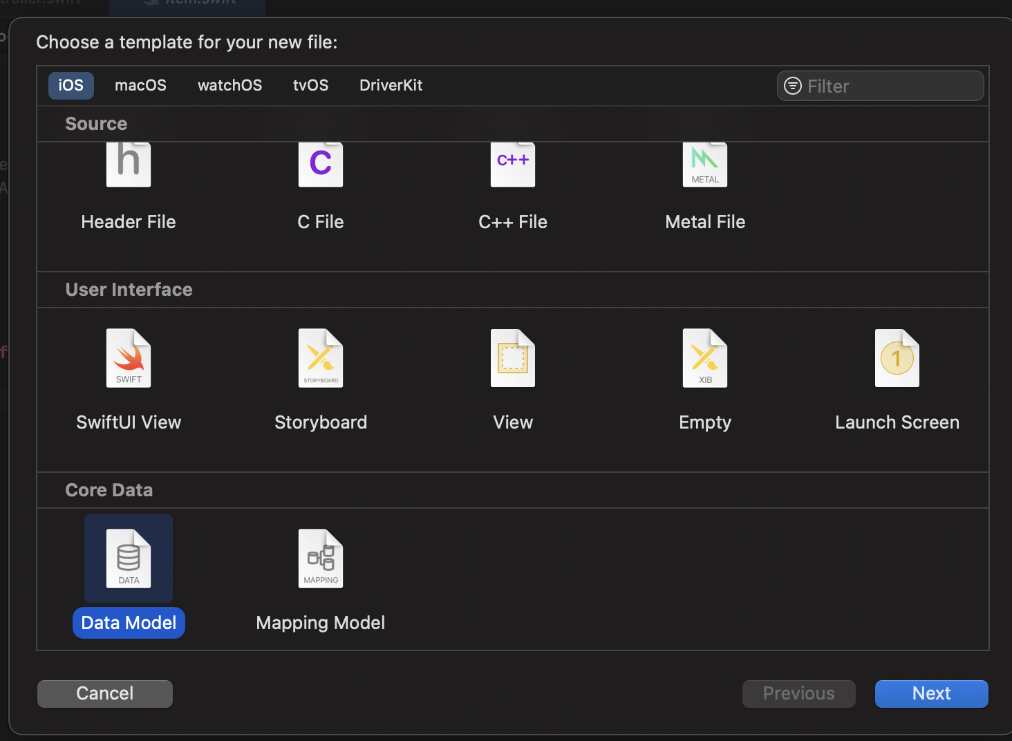 해당 프로젝트에서 처음부터 CoreData 체크표시 안했더라도 중간과정에서도 CoreData를 추가할 수 있다. 다음과 같은 방법으로 ..