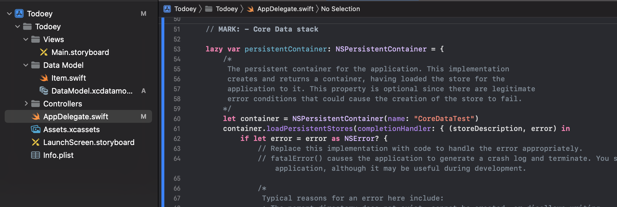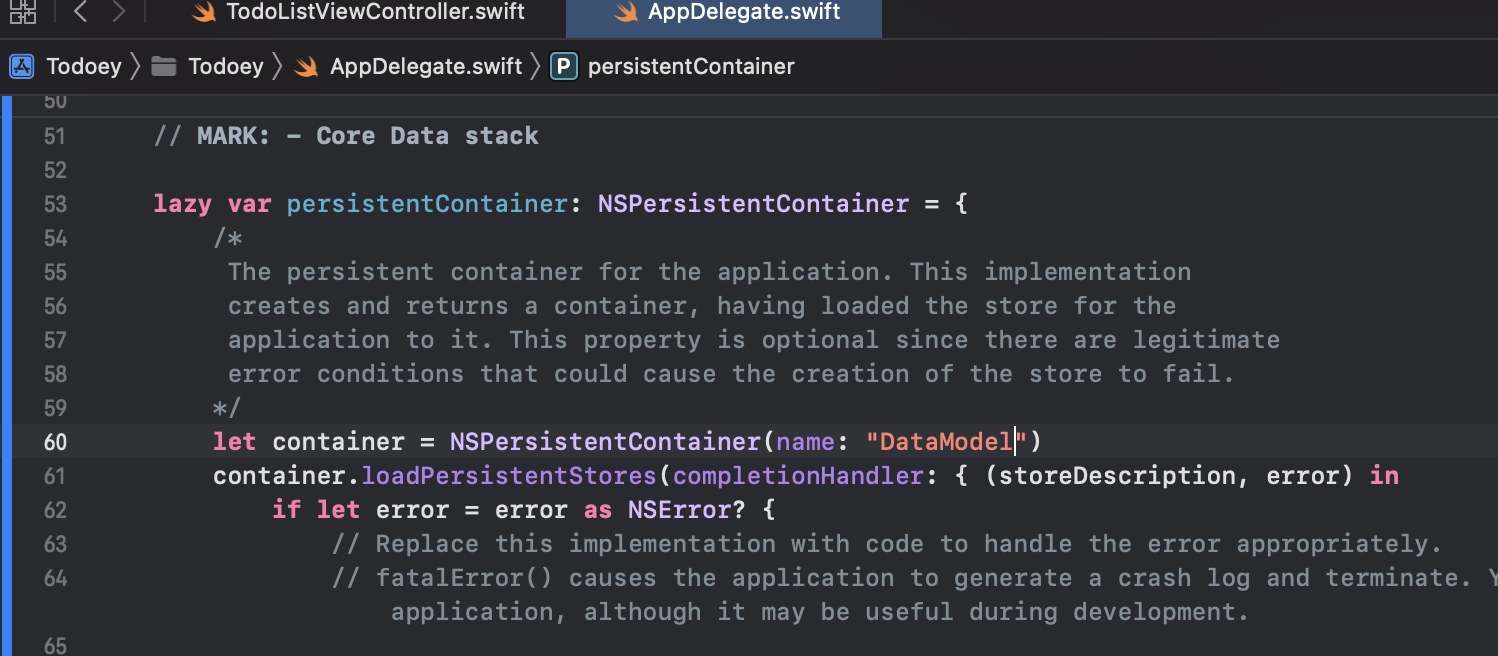 위에서 lazy var로 선언되는 NSPersistentContainer: 기본적으로 모든 데이터를 저장할 위치. 실제로는 SQLite 데이터베이스가 된다.