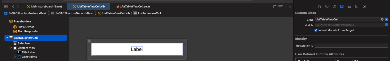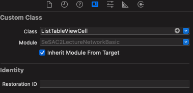 왼쪽의 계층 구조에서 맨 위에 TableViewCell쪽의 identifier및 클래스를 연결시켜줘야함